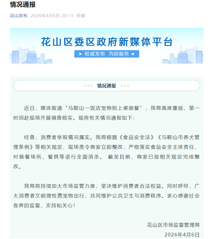 据媒体报道,4月6日,安徽省马鞍山市华山区市场监管局发布情况通报称,“近日,马鞍山市某酒店内出现一只家养狗作为食物”。有关部门对此高度重视,迅速赶赴现场调查核实此事。现将相关情况通报如下:经调查,消费者反映的情况属实。根据《食品安全法》、《马鞍山市犬只饲养管理条例》等相关规定,有关部门责令经营者立即就地整改,落实食品安全主体责任,对进食区域和用具进行彻底消毒。目前,卖家已按照相关规定完成整改。当局将继续加强市场监管,坚决保护合法权益的消费者。同时,我们呼吁消费者文明合理携带宠物出行,共同维护公共卫生和消费秩序。我们衷心感谢社会各界的关注、支持和关心。华山推出微信公众号