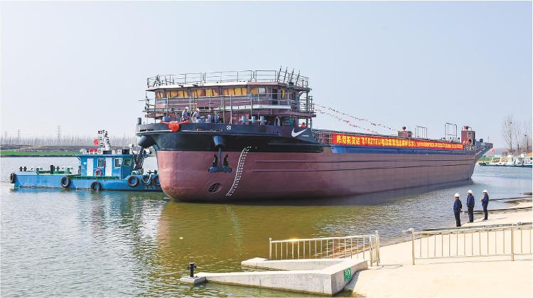 我国首艘纯电动出口内河集装箱船在祖城下水。山东打造的“绿色之船”启航驶向国际市场。祖城3月19日消息:本报今天上午9时58分报道,山东新能航运有限公司(以下简称“新能航运”)为法国全球主要航运公司达飞集团建造的182TEU(20英尺标准集装箱)纯电动集装箱船(上图)在祖城成功下水。该船总长79.9米,载货量3500吨。电池储能系统由宁德时代提供。交付后,该船将在越南平阳省至盖美港的航线上运营。预计每年运输量超过50,000 TEU,每年减少二氧化碳排放778吨。这是中国制造的纯电动内河集装箱船首次下水海上服务,意味着山东省具备提供“研发、制造、运营”一体化内河生态运输解决方案的能力。近年来,山东荣辉集团联合中集集团、宁德时代、武汉科技大学,在祖城市白马河畔打造了全国首个集研发、设计、智能制造于一体的标准化新能源船舶制造基地。山东荣辉集团旗下新能源造船迄今已获得船舶订单200余艘,已开工建造180余艘,其中89艘已顺利交付并投入运营。 (大中报记者 驻鲁广沙通讯员 张胜波 冯金阁报道)