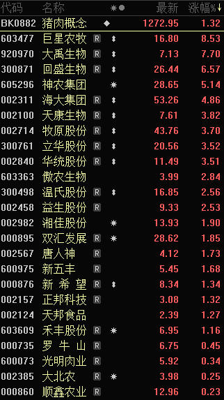 中新经纬4月2日电:4月2日,A股市场猪肉概念股大涨。截至中午,巨星农牧涨超8%,大宇生物涨超7%,汇生生物涨超6%,神农集团涨超5%,海达集团涨超4%,天康生物、牧原股份、利华股份、华通股份涨超3%,双汇发展等集体盈利增加。来源:东方财富 今日一早,商务部网站发文称,商务部、国家发展改革委、财政部目前正在实施中央储备冷冻猪肉收储工作,为维护猪肉市场平稳运行,更好履行中央储备监管职能。下一步,商务部将继续支付费用加强对猪肉市场的关注,加强走势分析研判,会同有关部门规范储备,确保市场平稳运行。截至目前,国家发展改革委和农业农村部相关司室已组织生猪养殖企业召开座谈会,分析研判价格形势,组织市场调控工作。会议指出,节后受消费需求下降影响,猪肉价格出现回落,已进入第一阶段预警区间,跌幅过大。据兴业证券数据,截至2026年3月27日,猪肉价格已于2018年5月跌至接近当年周期低点,但此后有所回升。与2018年不同的是,2021年开始,国内生猪养殖规模扩大,生产效率大幅提升。产能逐渐耗尽编辑。供需再平衡尚未完成,中长期猪肉价格还很难说会出现逆转。南华期货分析,从供需基本面来看,行业面临供给过剩和需求疲软的双重压力。供应端正面临罕见的“供应激增”。由于早期能育母猪存栏量持续高企以及生产效率提高,目前生猪屠宰量仍然很高。样本企业牺牲计划环比增幅明显,部分地区增幅超过40%。然而,需求面却极其疲弱。加之节后消费淡季,平时价格较低、能起到支撑作用的二次育肥、冷冻产品等都陷入停滞,支撑动能彻底消失。更重要的是,整个行业已经连续五年多处于亏损状态。连续几个月。不过,种猪存栏量的下降速度非常缓慢,也较上月有所恢复。这反映出育种业务仍在“循环”,而不是大幅降低产能,从而在损失和枯竭之间形成了危险的差距。展望后市,中汇期货认为,随着二季度商品猪的密集屠宰以及消费低迷期的持续,猪肉价格仍处于谷底,回升空间有限。今年下半年,减耕对能繁母猪的影响将逐步显现,中秋、国庆等季节性消费将更加活跃,供需格局有望小幅改善,价格中枢上行。但由于取消定义的范围有限,增幅仍然有限。 (中国/新加坡经纬APP)(本文观点仅供参考)仅供参考,不构成投资建议。投资有风险,入市需谨慎。)