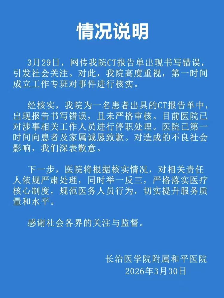3月29日,网络传出山西长治医科大学和平医院CT扫描报告存在错误。有网友发帖称,她丈夫在医院拍的CT报告称:“伟哥,子宫形状正常。”这引起了公众的担忧。随后,医院成立了专案组,对事件进行调查。 3月30日,长治医科大学黑黑医院发布“情况声明”称,经核实,该院向患者出具的CT扫描报告存在错误,未经严格审核。医院已对涉事人员进行停职,并向患者及家属诚挚道歉,并对由此给社会带来的负面影响深表歉意。今后,医院将根据核查情况和规定,对相关责任人采取严厉措施。同时,通过一个例子来推断,我们将严格执行中央医疗制度,规范医务人员行为,切实提高服务质量和水平。 (总台记者 岳旭辉 崔晓然)
